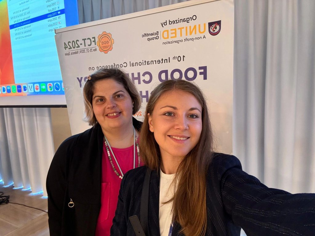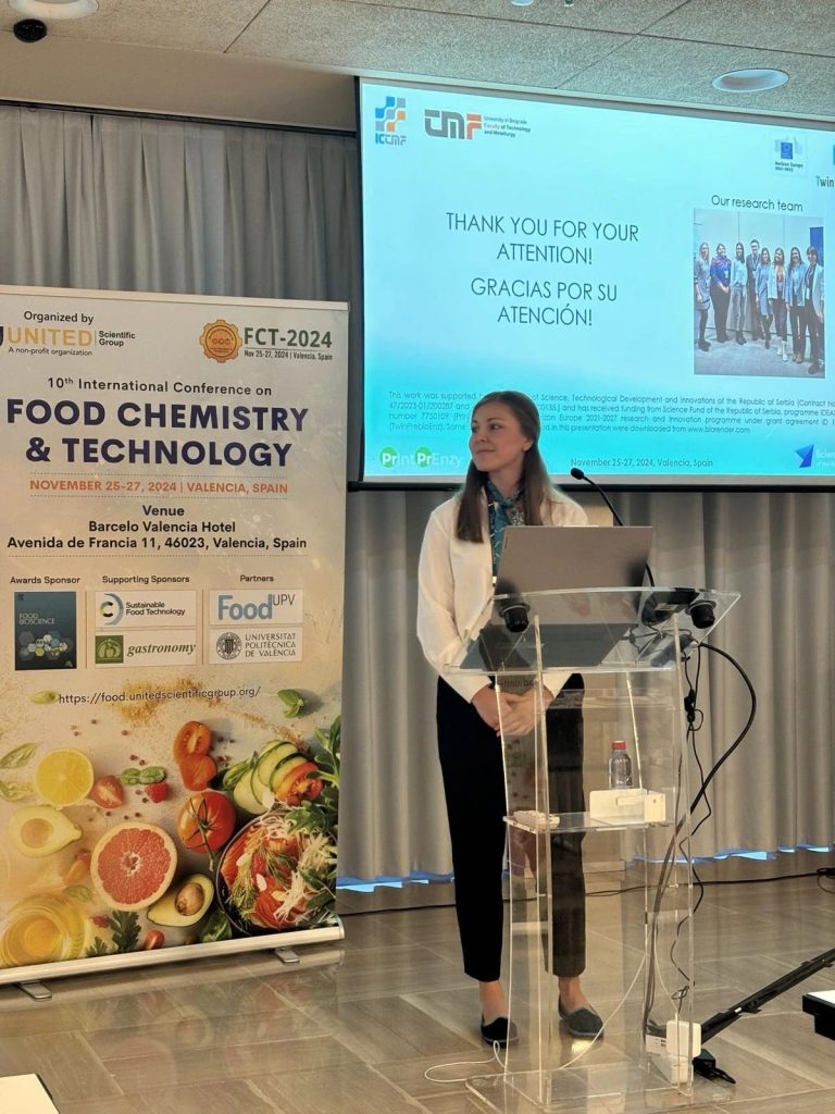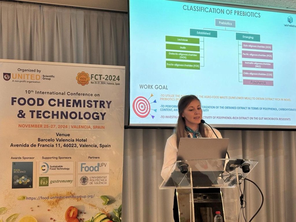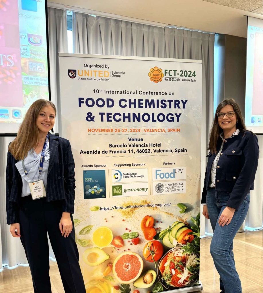 TwinPrebioEnz project members MSc Milica Veljković, MSc Anja Petrov Ivanković and Dr. Katarina Banjanac, attended the 10th International Conference on Food chemistry & technology, which was held in Valencia, Spain, 25 – 27th November 2024. The conference, organized by United scientific group (nonprofit organization), was an ideal event for the knowledge exchange as well as for presenting scientific contributions in the field of food technology. MSc Milica Veljković gave a lecture on the topic “From Waste to Taste: Characterization and investigation of the prebiotic effect of sunflower meal extract on gut microbiota residents”.